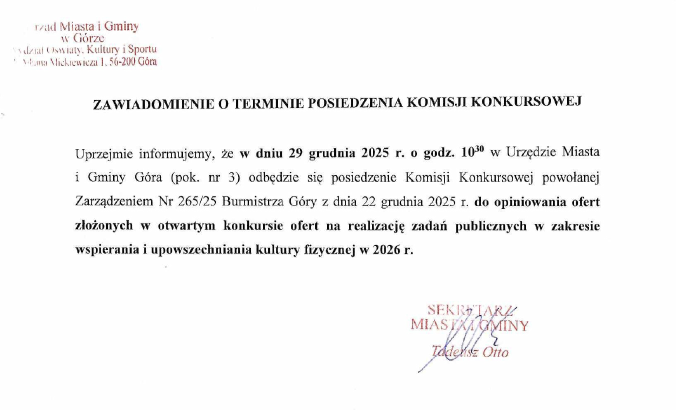 ZAWIADOMIENIE O TERMINIE POSIEDZENIA KOMISJI KONKURSOWEJ