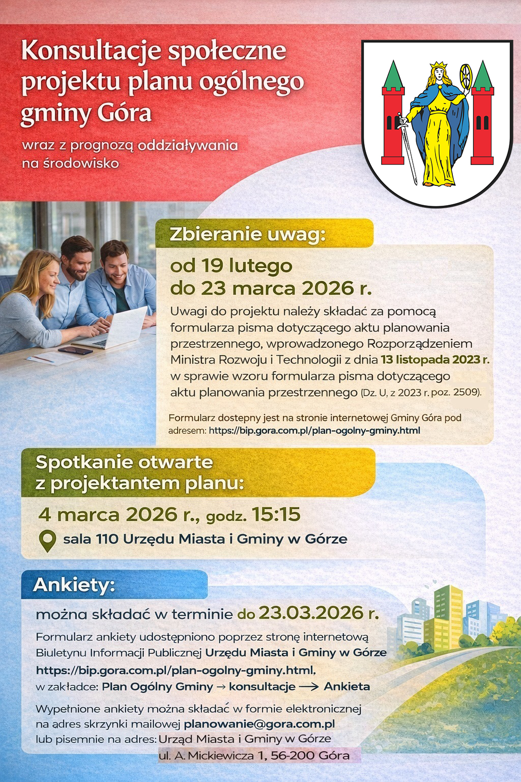 - dnia 4 marca 2026 r. o godz. 15:15, w Urzędzie Miasta i Gminy w Górze, ul. A. Mickiewicza 1, 56-200 Góra, sala 110 - spotkanie otwarte z projektantem planu, poprzedzone prezentacją projektu planu ogólnego;